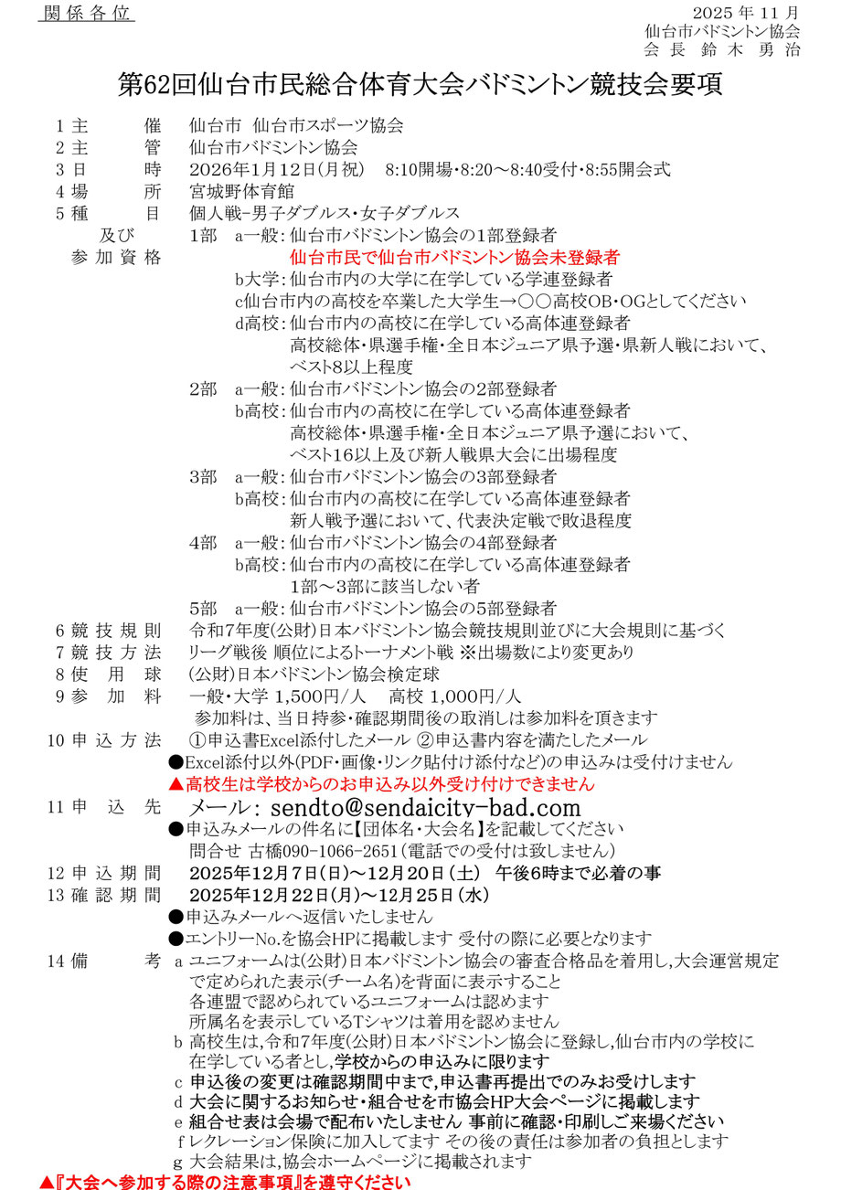【大会に参加する際の注意事項】をコロナ5類感染症以降に伴い改訂しました。参加される選手のみな様は,ご確認の上来場ください。